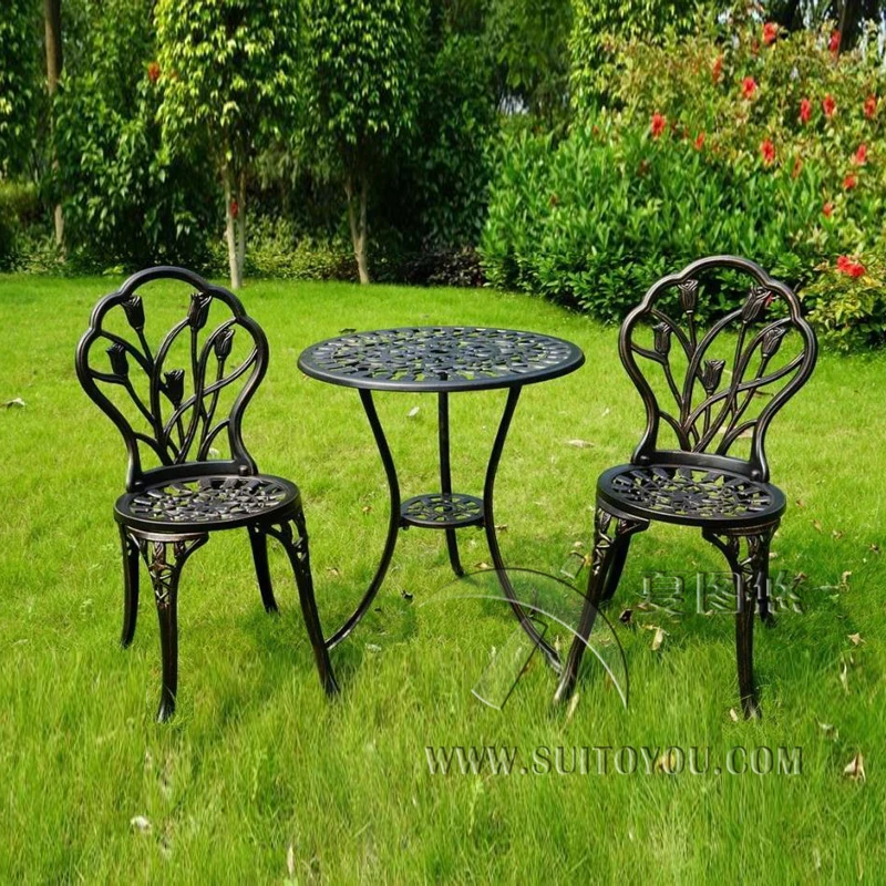 The cast aluminum table and 2 chairs are weather resistant to withstand the elements and remain sturdy for. Made from cast aluminum, the set includes two, 2, chairs and one, 1, round mesh table. Treat yourself and your special someone to an elegant dinner in the antique bistro set, designed in classic style, and built to last with sturdy aluminum.