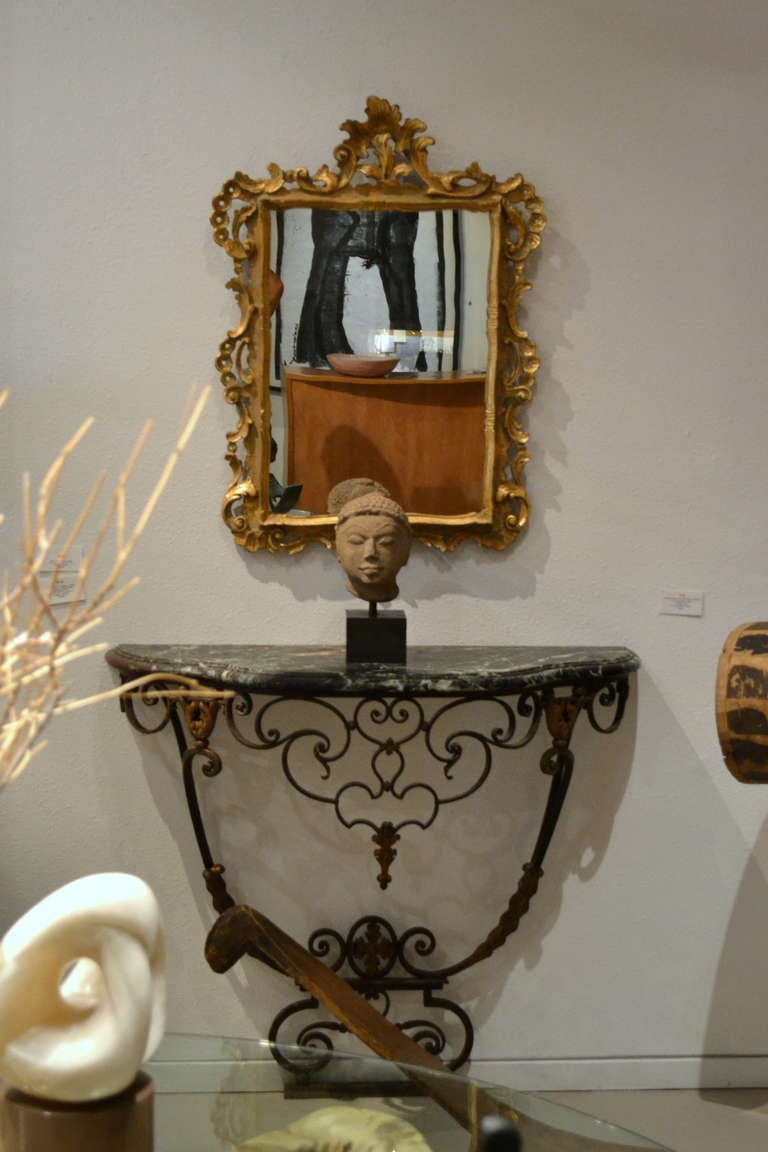 Table is very sturdy & easily moved around. An antique wrought iron patio furniture table and chairs can serve as a crafts station or home office work table. This french iron table is a lovely shade of green with previous paint showing through. 1940s wrought iron table in the style of merceris, pupil of poillerat, green marble top.