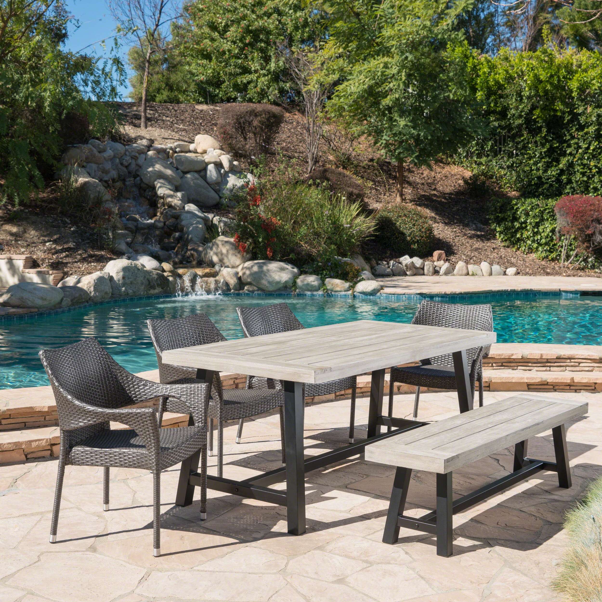 Grey Outdoor Dining Set. Outdoor dining sets are available in large kits that include an entire ensemble — chairs, tables, umbrella, and more. Find stylish home furnishings and decor at great prices! This is ideal if you're upgrading an existing set to add room for more guests or providing seating in a smaller area.