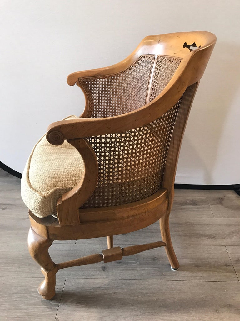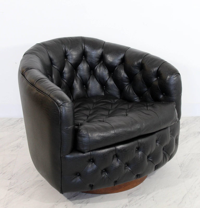 This pair features barrel back walnut frames with tapered legs and a cream naugahyde upholstery. Stained beech, black pirelli webbing. Retro styles are another theme where barrel chairs shine.