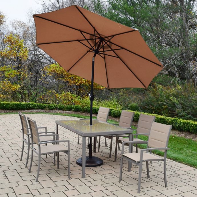 Tempered glass tabletop that is. The contemporary collection includes padded sling dining chairs, lounge chairs, loveseats, chaise lounges, and sofas. Tempered glass tabletop includes convenient umbrella hole. Hampton bay dining sets furniture sets.