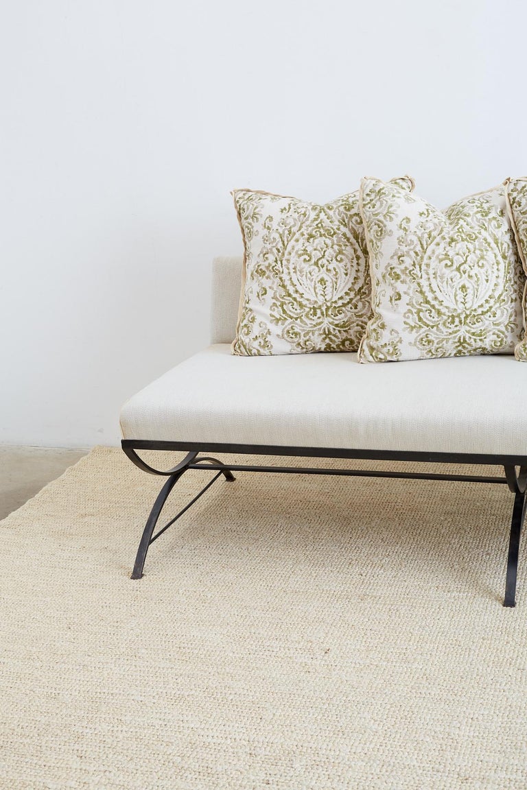 Wrought iron indoor outdoor garden daybed bench. Sitting bench linen padded metal wrought iron bench stool antique finish indoor. New forged bench at the building.